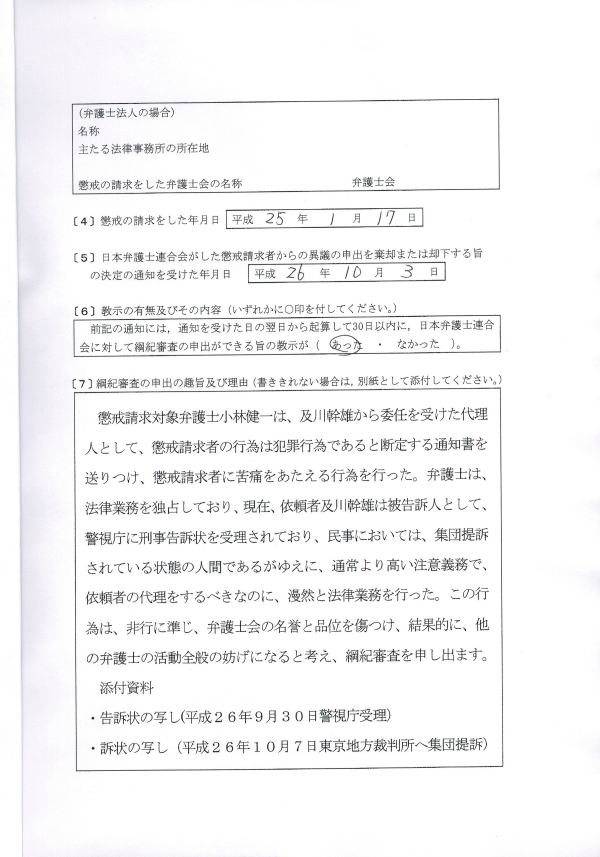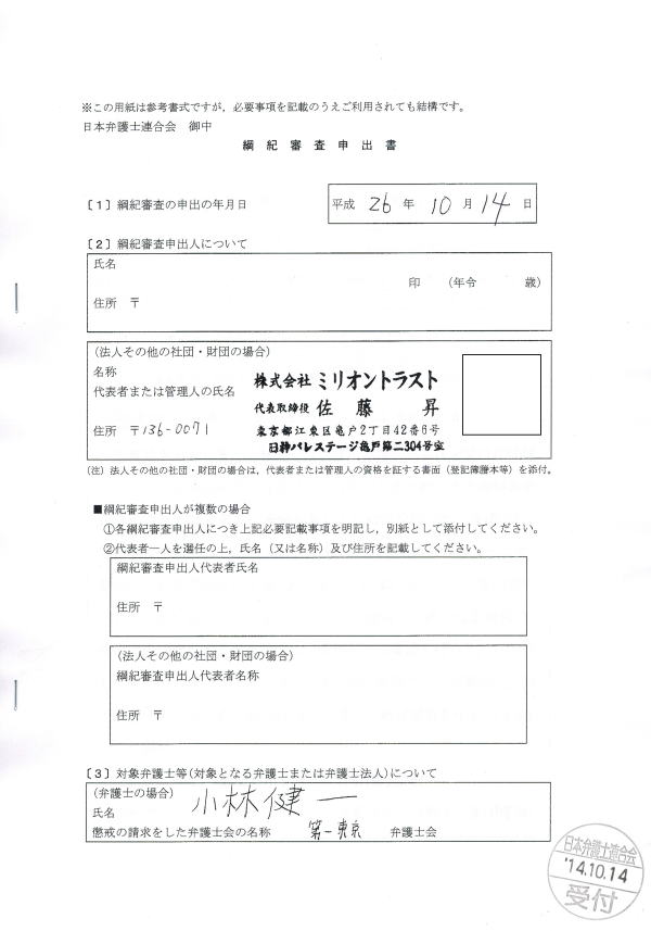 ![]() 既に及川幹雄被告より、1億1500万円を恐喝している、常習的犯罪者でみずほ銀行の裏顧問と名乗る大津洋三郎(26年8月19日記事)(敬天新聞26年8月25日記事、26年8月28日記事、26年9月26日記事)の証言を基に、佐藤昇の人間としての尊厳と人格を愚弄した内容の弁護活動を展開する品位の著しく欠いた敵前逃亡弁護士小林健一(西銀座法律事務所) |