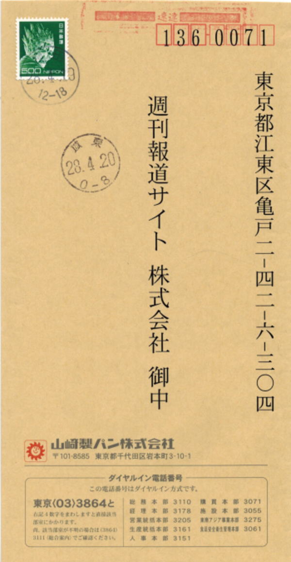![]() 異物混入の内部告発資料が 送付されてきた山崎製パンの大阪第一工場(平成28年5月2日記事) |