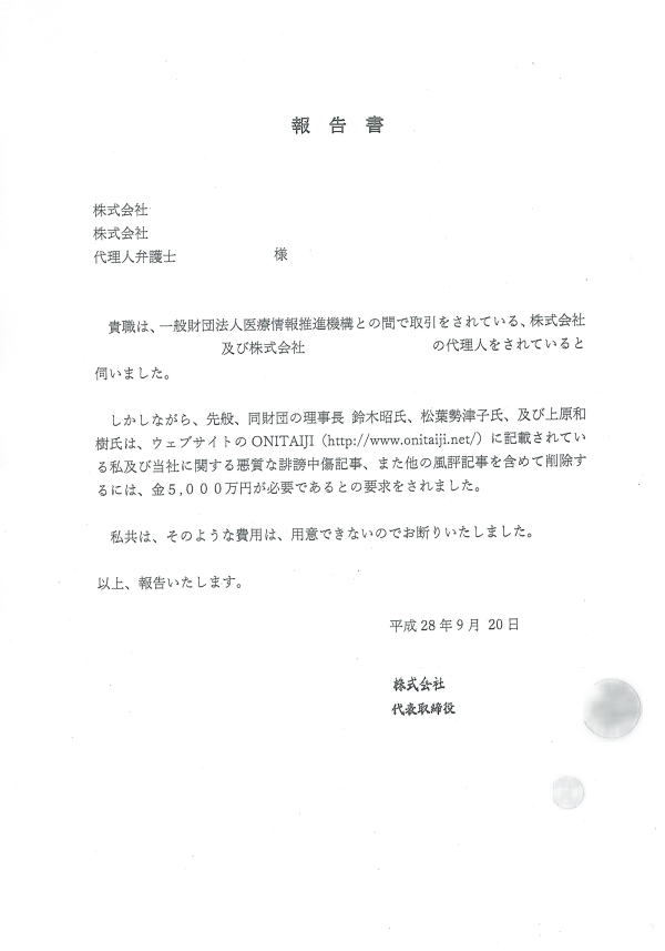 ![]() 5000万円の恐喝行為が行われたことを 証明する被害者の報告書(vol.9) |