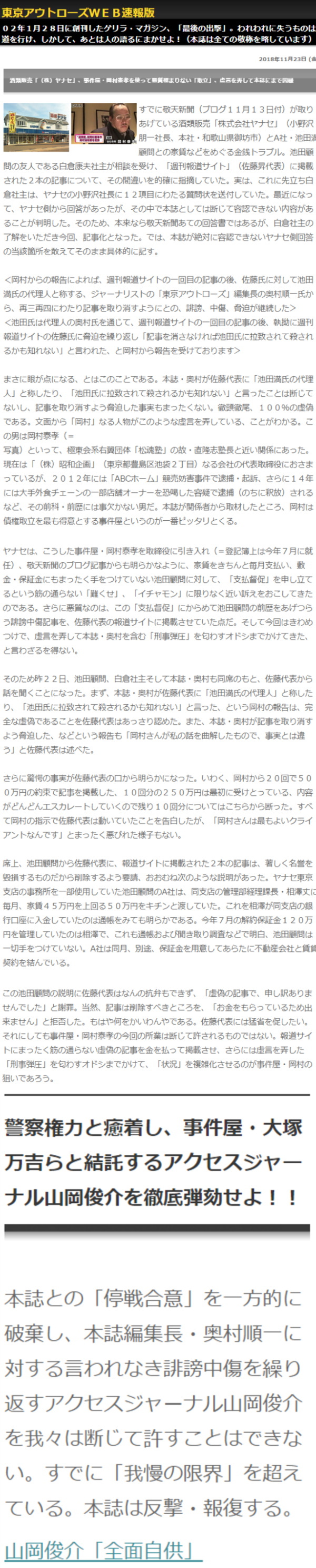 週刊報道サイトの関係者であると名乗り、承認なく勝手に活動した上、恐喝・恐喝未遂を行っている者が存在するとの告発が寄せられております。