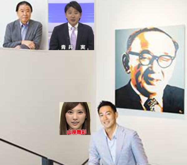 |  丸井グループ創業者青井忠治(右)の四男の青井忠四郎(上段左)と孫の青井実(NHKアナウンサー、上段右)と孫の青井茂(下段右)とその妻の山岸舞彩(フリーアナウンサー、下段左)(vol.1) |