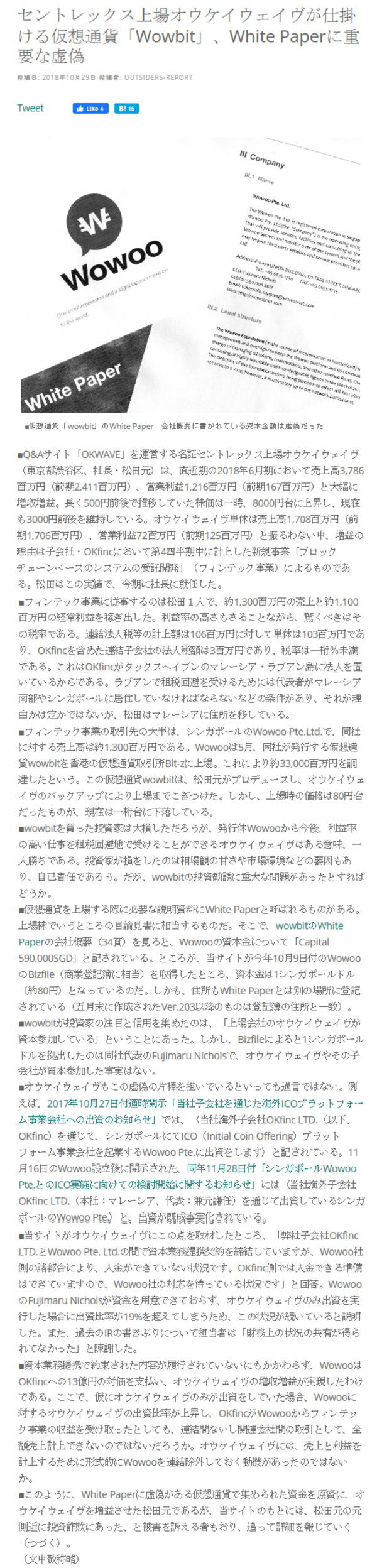 | 深まる謎、峯岸一劇場! M(株式会社W代表取締役)のM&I法律事務所の森脇伸也弁護士及び村治規行弁護士及び小西満弁護士及び西博生弁護士を代理人とした通知書によると、仮想通貨ワオビットWWB(Wowbit)と仮想通貨ワオエクスチェンジWWX(Wowoo Exchange)の売買は既に失効しているので、売買代金合計2億2814万6169円全額の返還を請求催促し、その支払いなき場合には、直ちに民事・刑事を問わず一切の法的手続きを執る所存であると記されている。 一方、著名政治結社の右翼団体S名義による株式会社W(代表取締役:M、大阪府大阪市W本社ビル)への「貴社の即時廃業並びに違法収益の税務申告の即時履行」を要求する上場企業(ジャスダック上場のGFAか?、名証セントレックス上場の株式会社オウケイウェイブか?)絡みの警告書には、株式会社W(代表取締役:M、大阪府大阪市W本社ビル)らが被害者と称して、新たな上場企業(名証セントレックス上場の株式会社オウケイウェイブか?)を恐喝していると記されている。 そして、「ジャーナリストの王者」佐藤昇が、峯岸一へ、令和2年3月2日13:30から赤坂エクセルホテル東急3階で、直接面談の上で事情を聴いた中で、峯岸一が佐藤昇へ、右翼団体S名義の警告書の写しを直接渡してきた際に、 佐藤昇「なぜ、このような脅迫文としか解釈できない内容の警告書を、わざわざ右翼団体Sが出す必要があるのか?」 峯岸一「名証セントレックス上場の株式会社オウケイウェイブが、M(株式会社W代表取締役)に民事・刑事を問わず一切の法的手続きを執らせないようにするため、著名政治結社の右翼団体Sに依頼して、警告書を出させたとしか考えられない。」 との質疑応答があった。 なお、M(株式会社W代表取締役)は、峯岸一と、金員を回収すると称したコンサルタント契約を締結していることを認諾している。 また、関東財務局金融庁監督局総務課への要求書(行政手続き法第36条3項)によると、平成29年12月にオウケイウェイヴの会員である数千万人が利用して価格が絶対に上がると巧みに説明され、平成30年1月に仮想通貨ワオビットWWB(Wowbit)の購入に7千万円支払ったが、平成30年5月にICO(仮想通貨の新規発行)を行ったものの価格は一向に上がらないということから、要求書による告発に至ったのだという。 そして、「ジャーナリストの王者」佐藤昇が、峯岸一へ、令和2年3月2日13:30から赤坂エクセルホテル東急3階で、直接面談の上で事情を聴いた後日に、峯岸一から電話が着て、その告発者とは密に連絡を取っているようなニュアンスを言っていたが、その告発者は、峯岸一に勝手に名前や状況を利用しないように強く抗議している模様であり、峯岸一という無知でただの寸借詐欺師のような人物は、本告発の問題解決にとって邪魔者以外の何者でもないとの論評をしている。 また、この告発者が、2019年12月14日土曜日18:07に、ラインで、警視庁組織犯罪対策部の名刺を流布していることが、その後の取材で明らかになっている。 なお、令和元年刑(わ)第1780号の判決文によると、峯岸一は「飛び込むぞ(警察に行くという意味)」と言ったり、「松田元に関する記事を山岡俊介を使ってインターネットニュース(アクセスジャーナル)に書かせた」と言ったり、「恐喝は自分の生業である」と言ったりする不思議な御仁であり、謎は深まるばかりである。 そして、2020年4月14日、オウケイウェイヴの松田元は、インサイダー疑義で同年同月27日に辞任することを発表した。(vol.7) |
