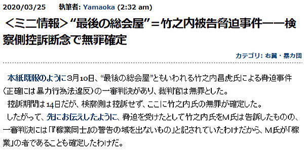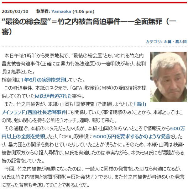 | 令和元年刑(わ)第1780号・暴力行為等処罰に関する法律違反事件・判決文、要旨抜粋 主文 竹之内昌虎は無罪。 第1 本件の公訴事実 竹之内昌虎は、自己の知人であるMに関する記事を峯岸一がインターネット上に掲載させたと考えて立腹し、自己が指定暴力団三代目侠道会構成員を利用できる旨仮装して峯岸一を脅迫しようと考え、平成31年1月7日午後7時13分頃から同日午後7時24分頃までの間、峯岸一方にいた峯岸一(当時55歳)に対し、「Mの記事の件で、弘田の親分に怒られた」「これ以上Mを攻撃したら、侠道会使っておまえをさらって殺す」旨申し向け、同人の身体等にいかなる危害を加えかねない気勢を示し、もって団体を仮装して威力をしめして脅迫したものである。 第2 関係証拠から認められる事実経緯等 2 峯岸一は、NPO法人ちいさなアリの手の顧問として、障碍者や孤児等の就職支援をするほか、個人的に企業の新規事業の考案やプロデュースをする仕事をしていると自称している。 峯岸一の実父は、現在の神戸山口組侠友会を、寺岡修と共に立ち上げた人物であり、峯岸一と寺岡修は家族同然の関係にあるが、峯岸一自身は組織に属したことはなかった(峯岸一は、供述調書において、「私自身は組織とは一切関係なく、これまで一度もヤクザにゲソ付けしたこともありません。」と述べている)。 また、山岡俊介は、「アクセスジャーナル」というネットジャーナルを運営する者であるが、約10年前に峯岸一が関わり逮捕されたトランスデジタル社をめぐる事件について記事を掲載したことをきっかけに、峯岸一が山岡俊介に連絡したことから知り合いとなり、その後、峯岸一は山岡俊介のネタ元となっていた。 第3 竹之内昌虎と峯岸一との関係及び本件通話に関する両名の供述要旨 2 竹之内昌虎は、公判廷において、要旨次のとおり供述する。 平成30年の夏頃、笹尾明孝から、オウケイウェイヴという会社で仮想通貨を取り扱っている松田元の関係で、峯岸一が会いたがっているというので、峯岸一と会った。 峯岸一は、松田元が仮想通貨の会社をやって儲けた金の半分をシンガポールやマレーシアに隠しており、松田元に関する記事を山岡俊介を使ってインターネットニュース(アクセスジャーナル)に書かせたと言っていた。 そして、竹之内昌虎の知り合いを使って、松田元をゆする話を何度も持ち掛けてきたが、竹之内昌虎は断った。 GFAの新規事業に関する提案はなかった。 峯岸一とは七、八回は会っている。その間、峯岸一は、恐喝は自分の生業であるとして、トランスデジタル事件で逮捕されたことや、電通の子会社である電通ワークスの不正経理をネタにして恐喝をした話を聞かされた。 第4 竹之内昌虎と峯岸一の公判供述の信用性について 3 以上によれば、竹之内昌虎の供述は信用でき、これに反する峯岸一の供述は全く信用できず、本件通話の内容は、竹之内昌虎が述べるとおりのものであったと認められる。 竹之内昌虎自身が認める峯岸一に対する発言も、竹之内昌虎がいうところの「稼業同士」の警告の域を出ないものであり、団体を仮装して威力を示した脅迫とはいえない。 そうすると、本件公訴事実については犯罪の証明がないことになるから、刑事訴訟法336条により竹之内昌虎に対し無罪の言い渡しをする。 (求刑・懲役1年6月) 令和2年3月10日 東京地方裁判所刑事第13部 そして、本日(令和2年4月27日)、松田元は、代表取締役社長を辞任して、オウケイウェイヴの舞台から退場した。 (vol.8) |