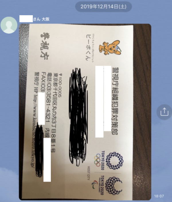 |  関東財務局金融庁監督局総務課に要求書(行政手続き法第36条3項)を通知して告発を行っていた者がいた。 そして、この告発者が、2019年12月14日土曜日18:07に、ラインで、警視庁組織犯罪対策部の名刺を流布していたことが、その後の取材で明らかになった。(vol.6) |