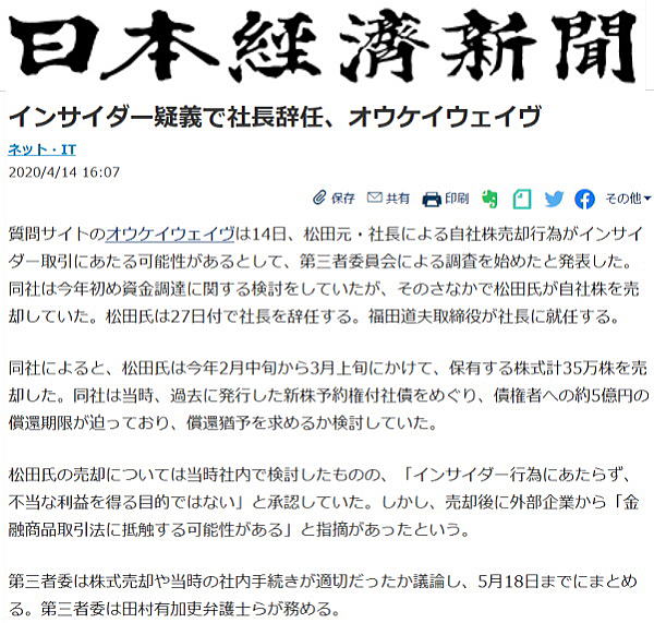 | 〇インサイダー疑義で松田元社長辞任、オウケイウェイヴ(日本経済新聞 2020/4/14 16:07) 質問サイトのオウケイウェイヴは14日、松田元・社長による自社株売却行為がインサイダー取引にあたる可能性があるとして、第三者委員会による調査を始めたと発表した。同社は今年初め資金調達に関する検討をしていたが、そのさなかで松田氏が自社株を売却していた。 松田氏は27日付で社長を辞任する。福田道夫取締役が社長に就任する。 同社によると、松田氏は今年2月中旬から3月上旬にかけて、保有する株式計35万株を売却した。同社は当時、過去に発行した新株予約権付社債をめぐり、債権者への約5億円の償還期限が迫っており、償還猶予を求めるか検討していた。 松田氏の売却については当時社内で検討したものの、「インサイダー行為にあたらず、不当な利益を得る目的ではない」と承認していた。 しかし、売却後に外部企業から「金融商品取引法に抵触する可能性がある」と指摘があったという。 第三者委は株式売却や当時の社内手続きが適切だったか議論し、5月18日までにまとめる。第三者委は田村有加吏弁護士らが務める。 https://www.nikkei.com/article/DGXMZO58031660U0A410C2X30000/ |