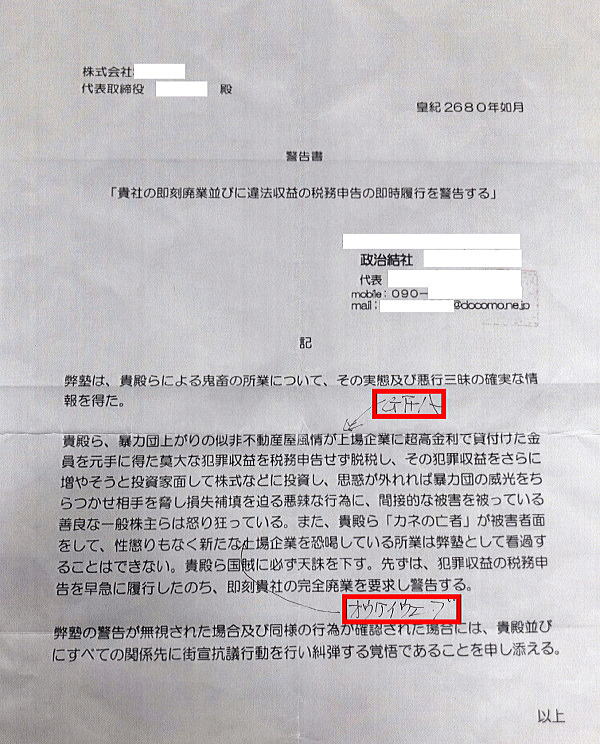 |  令和2年3月2日、峯岸一から直接提供された右翼団体S名義の警告書。ジャスダック上場のGFAと名証セントレックス上場のオウケイウェイブの企業名が手書きで記されていた。(vol.2) 著名政治結社の右翼団体S名義の警告書は、東京都の銀座の消印であり、W社(代表取締役:M、大阪府大阪市W本社ビル)には、令和2年2月21日に到着しているが、右翼団体Sの塾長は発布したこともなく、もちろん、W社に対して送付したこともないことが取材で明らかになった。「この警告書は、峯岸一の自作自演であろう。こんな事をする峯岸一の逮捕も近いのではないか?」(事情通)(vol.3) |
