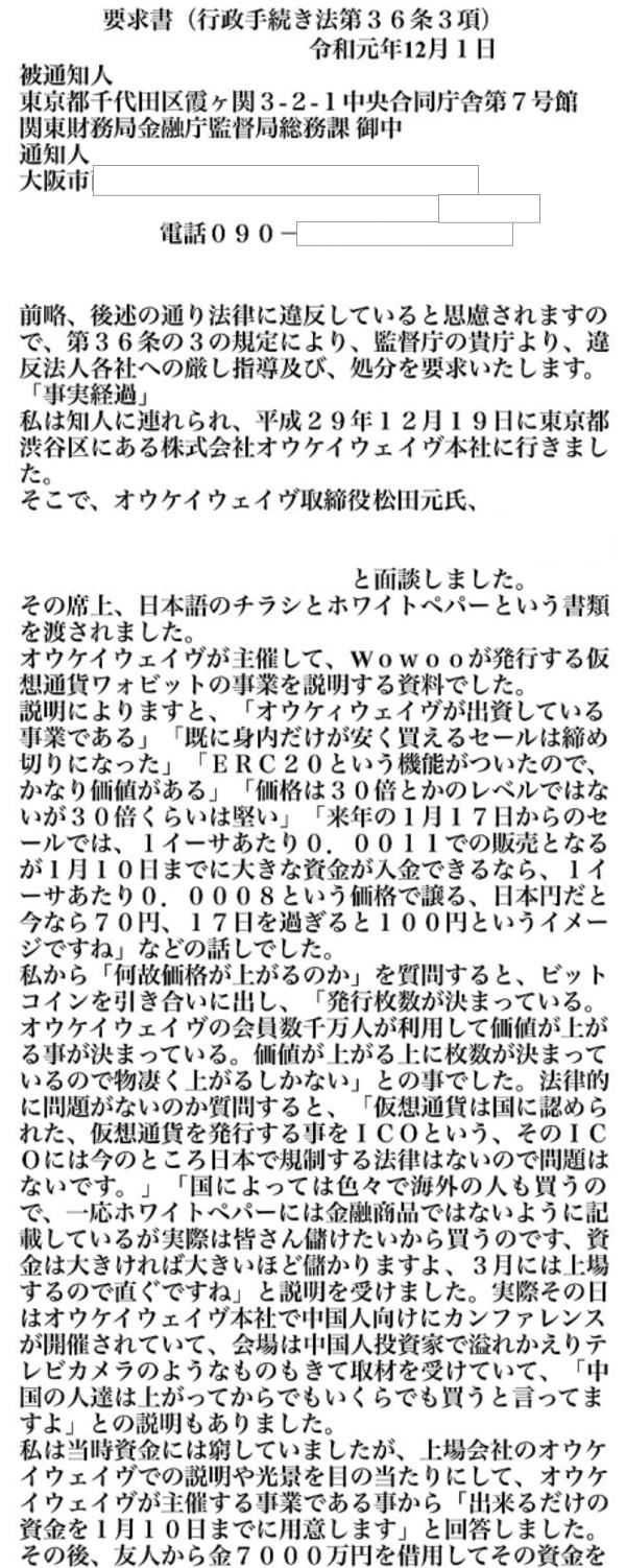|  著名政治結社の右翼団体S名義により警告を受けていたM(株式会社W代表取締役)による、仮想通貨ワオビットWWB(Wowbit)と仮想通貨ワオエクスチェンジWWX(Wowoo Exchange)の売買代金合計2億2814万6169円全額の返還を請求催促し、お支払いなき場合には、直ちに民事・刑事を問わず一切の法的手続きを執る旨の令和元年12月23日付通知書(vol.4) |