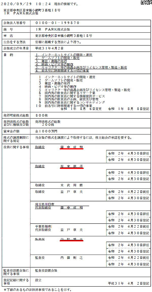 | 田中成和、坂本徳子、小野明夫が、IR PARK株式会社(東京都中央区日本橋小網町3−18、JDR.株式会社と同じ住所)で取締役として揃い踏みしていた。 ただし、コロナ禍の令和2年4月30日に、揃って辞任している。(vol.66) |