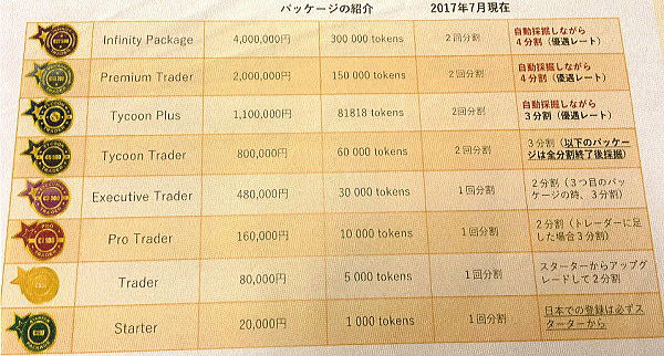 | 〇パッケージの紹介 2017年7月現在 Infinity Package 4,000,000円 Premium Trader 2,000,000円 Tycoon Plus 1,100,000円 Tycoon Trader 800,000円 Executive Trader 480,000円 Pro Trader 160,000円 Trader 80,000円 Starter 20,000円(vol.62) |