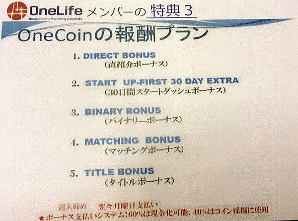 ![]() ワンライフメンバーの特典3、ワンコインの報酬プラン、1・直紹介ボーナス、2・30日間スタートダッシュボーナス、3・バイナリーボーナス、4・マッチングボーナス、5・タイトルボーナス。(vol.60) |