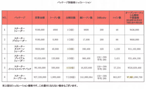 | 〇パッケージ別価格シュミレーション パッケージ 投資金額 オープンマーケット公開時予想価格 1 スターター トレーダー 100,000円 436,800円(4.3倍) 2 スターター プロトレーダー 180,000円 800,800円(4.4倍) 3 スターター タイクーン トレーダー 820,000円 11,102,000円 (13.5倍) 4 スターター プレミアム トレーダー 2,020,000円 31,404,100円 (15.5倍) 5 スターター イニシャルロンチパック 8,100,000円 520,829,400円 (64.2倍) 6 スターター スープリーム 27,320,000円 7,861,098,700円 (287.74倍) ※上記はシュミレーション価格です。この通りにならない場合もございます。(vol.63) |