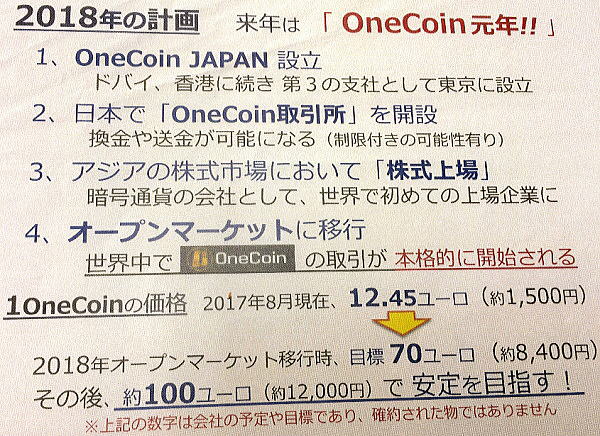 | 〇2018年の計画 来年は「ワンコイン(OneCoin)元年!!」 1 ワンコイン ジャパン(OneCoin JAPAN)設立 ドバイ、香港に続き第3の支社として東京に設立 2 日本で「ワンコイン(OneCoin)取引所」を開設 換金や送金が可能になる(制限付きの可能性有り) 3 アジアの株式市場において「株式上場」 暗号通貨の会社として、世界で初めての上場企業に 4 オープンマーケットに移行 世界中でワンコイン(OneCoin)の取引が本格的に開始される ※上記の数字は会社の予定や目標であり、確約された物ではありません。(vol.61) |