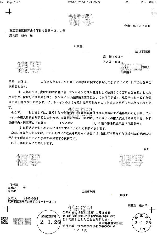 高見澤威夫が、令和1年11月25日付の内容証明郵便物で、『現金を返してくれとの望みが有れば、退会届か、内容証明郵便で請求したら、ワンコインと交換に現金と銀行金利を御支払い致します』とのお約束を通知していたので、令和2年1月26日付の内容証明郵便物で、『ワンコインの購入代金を振込送金してお支払い頂きますよう』高見澤威夫へ、弁護士名義で請求してみました。 通知書 令和2年1月26日 東京都港区南青山5丁目4番5−311号 高見澤威夫 殿 東京都 ○○法律事務所 代理人弁護士 前略 当職は、○○○○の代理人として、ワンコインの取引に関する貴殿との折衝について、以下のとおりご連絡致します。 ○○は、これまでに、貴殿の勧誘に基づき、ワンコインの購入費用として総額500万円をお支払いしておりますが、貴殿もご承知のとおり、ワンコインは仮想通貨業界においても信用が低く、現段階でも一般的な意味での上場はされておらず、ビットコインのような取引は不可能であることが明らかになっております。 そこで、○○としましては、貴殿からの令和1年11月25日付けの通知書にてご連絡頂いたとおり、ワンコインの購入契約を解除致しますので、本書面到達後7日以内に、ワンコインの購入代金500万円を、みずほ銀行虎ノ門支店の「弁護士」名義の普通預金口座に振込送金してお支払い頂きますようよろしくお願い致します。 なお、当方としましては、上記期間内にご返金を頂けない場合には、誠に不本意ながら正規の法的手続に移行させて頂きますことを念のため付言する次第です。 以上、要用のみにて失礼します。 草々 (vol.52) |