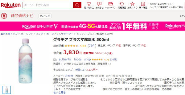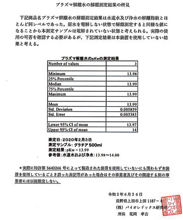 ![]() まさかのグラチアによる虚偽報告だった!ローソン(代表取締役社長:竹増貞信)は、Gratiae(グラチア、代表取締役:木下建志・旧姓:木下健士)から、「プラズマ解離水」に関する井戸水の取水権や解離水の解離活性度について、デタラメ内容の報告を受けて、実質的な被害を受けていたことが判明したから、令和2年10月中旬でもってナチュラルローソンでの販売が終了する予定であることを決定し、インターネットにおける販売は、店頭販売に先行して、既に販売を終了したのであろうことが取材で明らかになった。私たち消費者が本当に必要な“水”は、ただの水道水(温泉水)ではなく、解離装置(特許4929430)を使用して解離された解離水の解離活性度を示すpKw値が13.19の“本物のプラズマ解離水”です。(vol.3) |