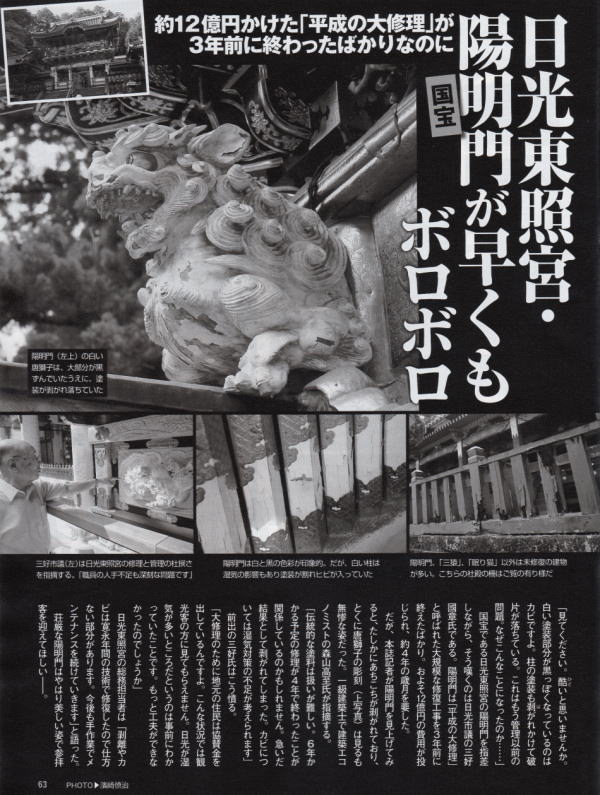 ![]() 「日光東照宮の国宝陽明門は、およそ12億円の費用を投じ、約4年の歳月をかけて、3年前に『平成の大修理』と呼ばれた大規模な修復工事を終えたばかりだが、早くもボロボロになっています」と日光市議の三好國章氏は述べている。(FRIDAY2020年10月2日号) 週刊報道サイト(佐藤昇責任編集)もお詫び広告の募集を開始します! |