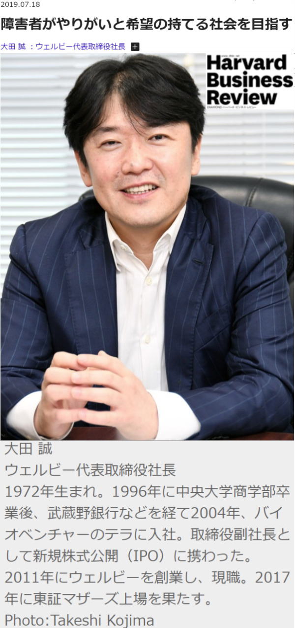 東証一部上場企業ウェルビーの代表取締役社長・大田誠は、コロナ治療薬開発をめぐる反社会的勢力(暴力団山口組系元組長菅原潮)や日比谷公園で自殺した瀧本憲治(maneo創業者)をも巻き込んだインサイダー取引事件の舞台のジャスダック上場企業テラの創業メンバー(取締役副社長)の経営陣であったが、一体コロナに効く『5―ALA』を何に使おうとしているのであろうか? その3 大田誠が率いるウェルビーは、合計230拠点の事業所で、就労移行支援のための職業訓練を、障害者という難しい属性ではあるが、得意先を埼玉県、東京都、神奈川県、千葉県の各国民健康保険団体連合会としているような、大いに社会貢献している公益的性格の極めて強い事業内容であることから、230拠点の事業所から、裁くのが困難を極める位の報告が上がってきて、その決済も次々に派生するだろうことから、朝は9時の定時の前から出社して、17時の定時には帰社できないような、過酷な仕事ぶりであることが連想される。大田誠には、あまり無理をしないで健康に留意しながら、公的な補助金が収益源である、公益性の極めて高い『障害者総合支援法による就労支援事業』に励んでもらいたい。(vol.3) |