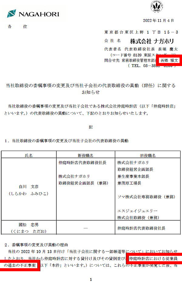 ![]() 東証スタンダード上場企業ナガホリ その21 ナガホリ連結子会社 仲庭時計店を巡りIRで株主共同の利益にはならないであろう丁々発止している場合なのか?仲庭時計店の異 常な損失発生の原因の「大口取引先の営業方針の大幅な転換内容」とは、一体、何なのだろうか?そして、取 材を進めていくと、仲庭時計店において何らかの良からぬ事象が発生していること、及び、ナガホリグループ において内部統制に欠陥があり、それが現経営陣によって隠蔽されてしまっている事実が明らかになった。深 い闇がナガホリグループの内部統制に潜んでいる模様だ。(vol.21) |