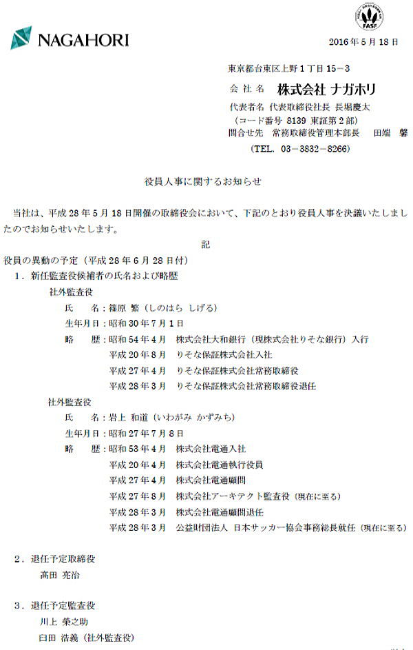 ![]() 東証スタンダード上場企業ナガホリ その20 謎の大沢商会にナガホリがまさかの優先株で増資なのか?平成27年11月、大沢商会は、ナガホリから出資を得て、非常勤役員2名(長堀慶太・吾郷雅文)を受け入れた。もし、その出資において、ナガホリが大沢商会の優先株式(A種株式)を1,600株所有しているのであれば、事実上の連結子会社と言えるのではないか?ナガホリにおける個人情報漏洩の事実に、物言う株主すら退散する「M&A最強タッグ」の太田洋弁護士(西村あさひ法律事務所)と株式会社アイ・アールジャパン(IRJ)(代表取締役社長CEO:寺下史郎)とパスファインド株式会社(代表取締役:津田誠、代表取締役:高橋前雄)は関わっているのであろうか? (vol.20) |
