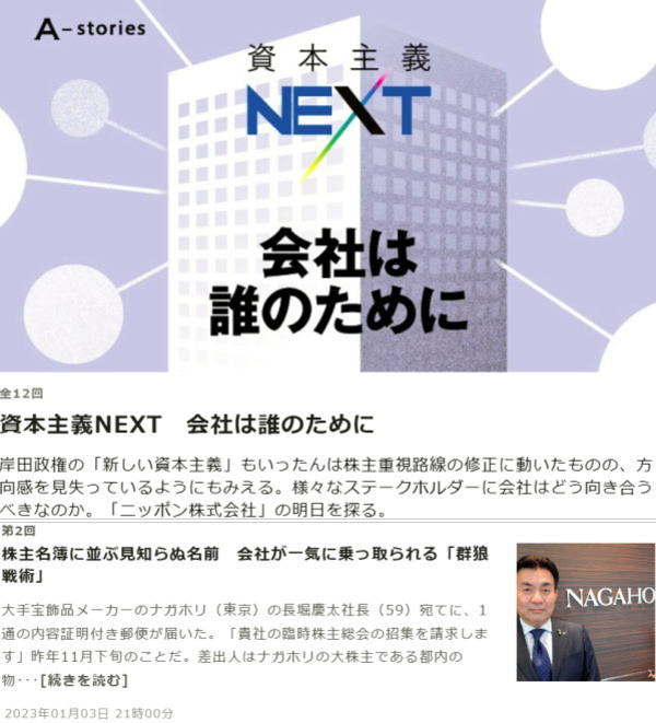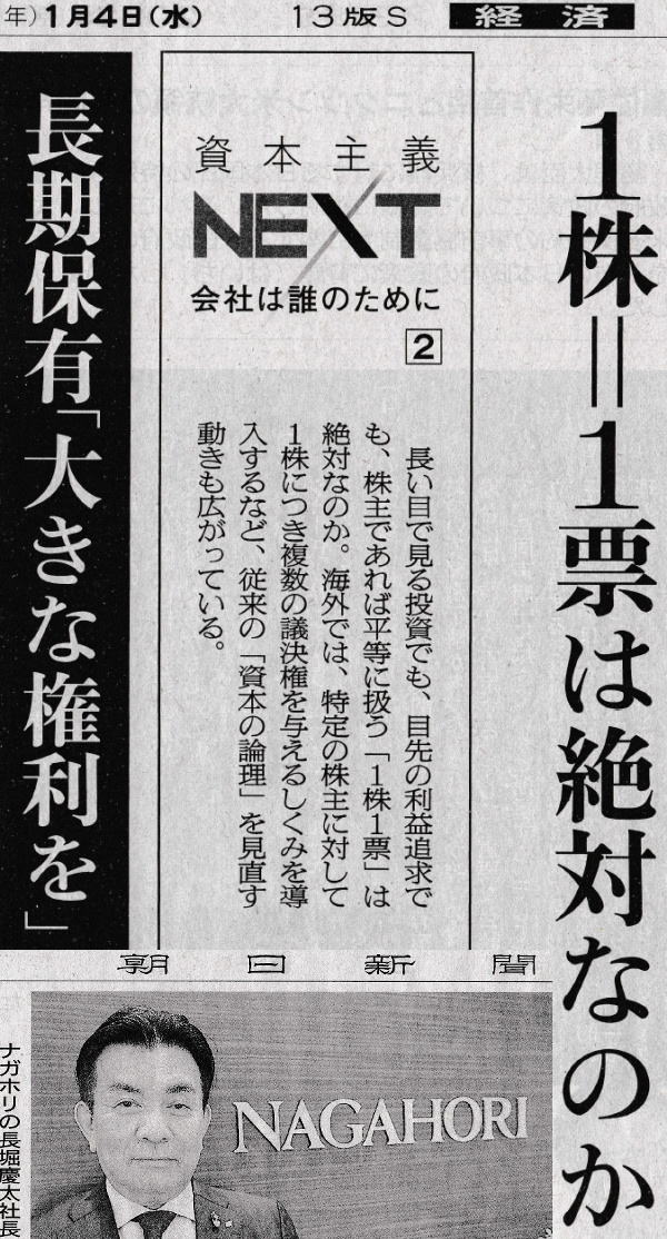 ![]() 東証スタンダード上場企業ナガホリ その29 1株=1票は絶対です! ナガホリ創業家2代目社長の長堀慶太が、自分に都合のよいことばかりを、朝日新聞の紙面を使って大放言!長堀慶太が疑念に苛まされているウルフパック戦術とは、生みの親がアイ・アールジャパン(IRJ)で、名付け親が太田洋弁護士らの西村あさひ法律事務所で、助手がパスファインドであり、マッチポンプ疑惑トリオとも言えるであろう。ナガホリとりそな銀行のめくられたくないであろう不適切な関係は?(vol.29) |