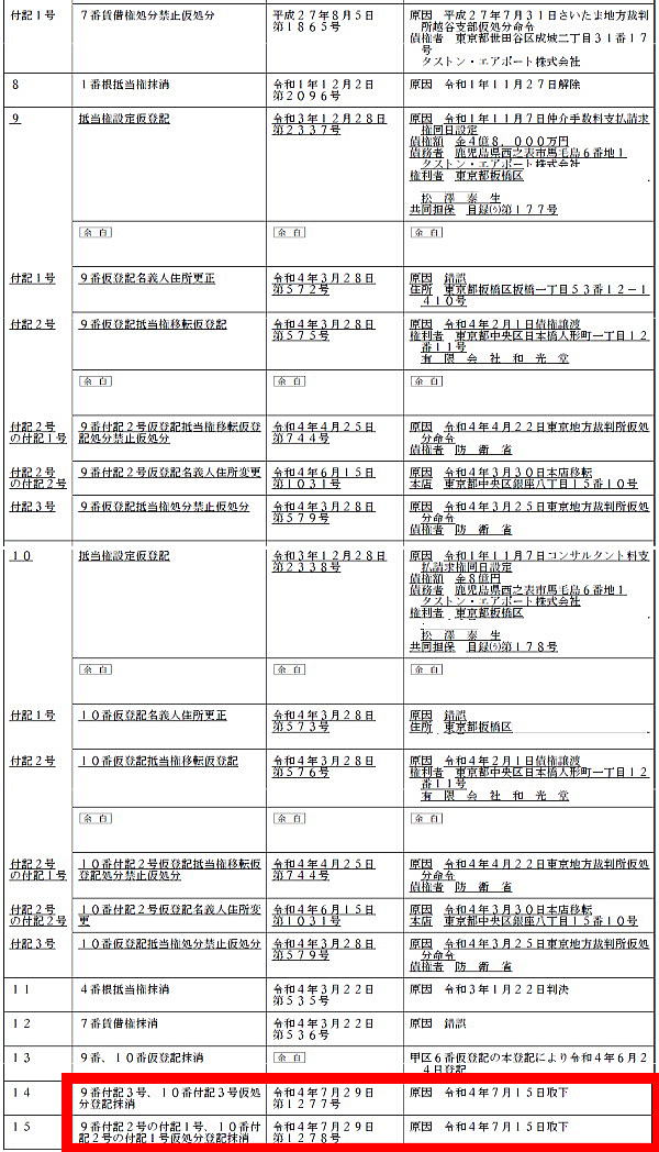 国防事案という究極の公共の利害に関する事実である馬毛島基地整備計画を考察する その17 まさかの防衛省による処分禁止仮処分だった!松澤泰生が権利者と称して、まさかの躍動!2022年3月28日、防衛省が債権者として、処分禁止仮処分が登記された。そして、同日、防衛省だけでなく、有限会社和光堂(東京都中央区銀座8−15−10、取締役:中島五月・取締役:高橋智美)なる法人が、松澤泰生の持つ仲介手数料支払請求権を4億8000万円及びコンサルタント料支払請求権8億円を2022年2月1日に譲受したとして、仮登記抵当権移転仮登記。馬毛島の残りの100億円をめぐり、国防事案という究極の公共の利害に関する事実である馬毛島基地整備計画をネタにして、防衛省は詐欺師たちと金の戦争をしている場合なのか?この不毛な100億円をめぐる馬毛島基地整備計画をネタにして跋扈する詐欺師たちによる金の戦争を生み出した菅義偉前総理大臣の責任が問われることになるのは間違いないであろう。(vol.17) |
