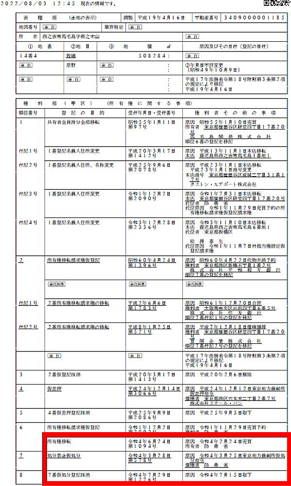 ![]() 国防事案という究極の公共の利害に関する事実である馬毛島基地整備計画を考察する その31 2022年7月29日、松澤泰生の抵当権設定仮登記が防衛省の所有権移転請求権仮登記を本登記にしたことで抹消された!しかし、2022年3月28日、防衛省による甲区への処分禁止仮処分よりも早く、松澤泰生の所有権移転請求権仮登記の移転を行って、同日、合同会社AMPM(代表社員:松澤秀民)なる法人へ登記した物件は、抹消されずに、そのままとなっている。跋扈する詐欺師たちをこのまま放置している状態であれば、国益に適うための国防政策に支障をきたすことは明らかであることから、一刻も早い詐欺師退治が必要であろう。(vol.31) |