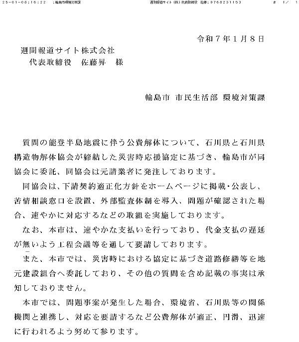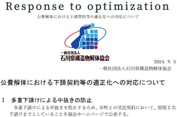 ![]() 能登半島地震による被災地の現状 その2 まさかの通行手形が出現!令和の時代に江戸時代のような搬入車両通行許可証が、輪島市の公費解体を請け負うブロック長の誠和建設株式会社(代表取締役:南由美子、会長:南征和)の名前ではなく、一般社団法人石川県構造物解体協会(代表理事:今村秀憲)の名前で発布。この江戸時代のような通行手形さながらの搬入車両通行許可証は、日本国の公金から石川県構造物解体協会が徴収した10%のマージンと、輪島市で公費解体業務に従事する全ての解体業者から誠和建設が石川県構造物解体協会と共に徴収した5%〜10%の実質的な手数料を原資にして作成されている。そして、戦前に戻ったような恐怖のアンケート調査票まで出現!「輪島市では、(公費解体工事代金の)速やかな支払いを行っており、代金支払の遅延が無いよう工程会議等を通して要請しております」などと輪島市は回答。(vol.2) |