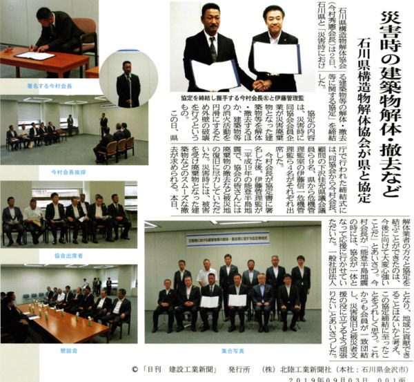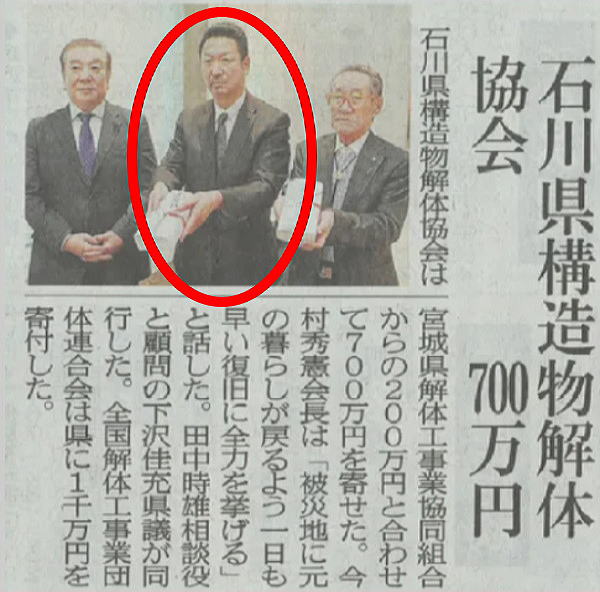 今村秀憲(右)石川県構造物解体協会会長能登半島地震による被災地の現状 その5 まさかの南征和逮捕だった!2014年1月25日、石川県警金沢西警察署は、誠和建設株式会社代表取締役社長南征和容疑者を道路交通法違反(酒気帯び運転)の疑いで現行犯逮捕した。誠和建設の南征和容疑者石川県警小松警察署の警察署協議会長であった。このような石川県直轄の一般社団法人石川県構造物解体協会(会長:今村秀憲(株式会社金沢斫解体業代表取締役))の副会長で、輪島市を請け負うブロック長の誠和建設株式会社(代表取締役:南由美子、会長:南征和)には、日本政府予算の予備費から支出された総額8150億円の巨額の資金の振り分けや、地震と豪雨の被害からの復旧・復興を一体として進める被災者や事業者がなりわいの再建を行えるようにするための創造的復興はできないといえるのではなかろうか?(vol.5) |