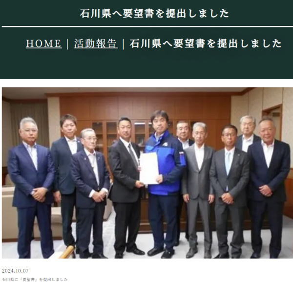![]() 誠和建設の南征和(中央)と今村秀憲(右)石川県構造物解体協会会長 能登半島地震による被災地の現状 その5 まさかの南征和逮捕だった!2014年1月25日、石川県警金沢西警察署は、誠和建設株式会社代表取締役社長南征和容疑者を道路交通法違反(酒気帯び運転)の疑いで現行犯逮捕した。誠和建設の南征和容疑者石川県警小松警察署の警察署協議会長であった。このような石川県直轄の一般社団法人石川県構造物解体協会(会長:今村秀憲(株式会社金沢斫解体業代表取締役))の副会長で、輪島市を請け負うブロック長の誠和建設株式会社(代表取締役:南由美子、会長:南征和)には、日本政府予算の予備費から支出された総額8150億円の巨額の資金の振り分けや、地震と豪雨の被害からの復旧・復興を一体として進める被災者や事業者がなりわいの再建を行えるようにするための創造的復興はできないといえるのではなかろうか?(vol.5) |