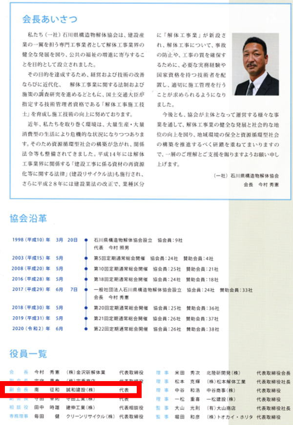 今村秀憲(左)石川県構造物解体協会会長と誠和建設の南征和(右)能登半島地震による被災地の現状 その5 まさかの南征和逮捕だった!2014年1月25日、石川県警金沢西警察署は、誠和建設株式会社代表取締役社長南征和容疑者を道路交通法違反(酒気帯び運転)の疑いで現行犯逮捕した。誠和建設の南征和容疑者石川県警小松警察署の警察署協議会長であった。このような石川県直轄の一般社団法人石川県構造物解体協会(会長:今村秀憲(株式会社金沢斫解体業代表取締役))の副会長で、輪島市を請け負うブロック長の誠和建設株式会社(代表取締役:南由美子、会長:南征和)には、日本政府予算の予備費から支出された総額8150億円の巨額の資金の振り分けや、地震と豪雨の被害からの復旧・復興を一体として進める被災者や事業者がなりわいの再建を行えるようにするための創造的復興はできないといえるのではなかろうか?(vol.5) |
