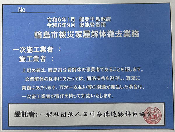 ![]() 能登半島地震による被災地の現状 その1 石川県直轄の一般社団法人石川県構造物解体協会を元請けとした、公費解体輪島市ブロック長誠和建設株式会社(代表取締役:南由美子、会長:南征和)による下請け業者への解体費用の支払い遅延。そして、スクラップ泥棒多発。更には、輪島塗の逸品を盗んで売却。これらの責任の所在は、一般社団法人石川県構造物解体協会、石川県、環境省にあることは言うまでもなかろう。(vol.1) |