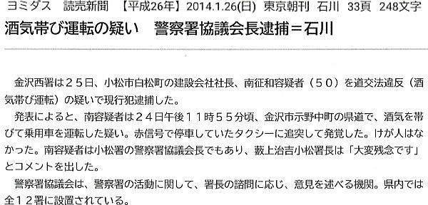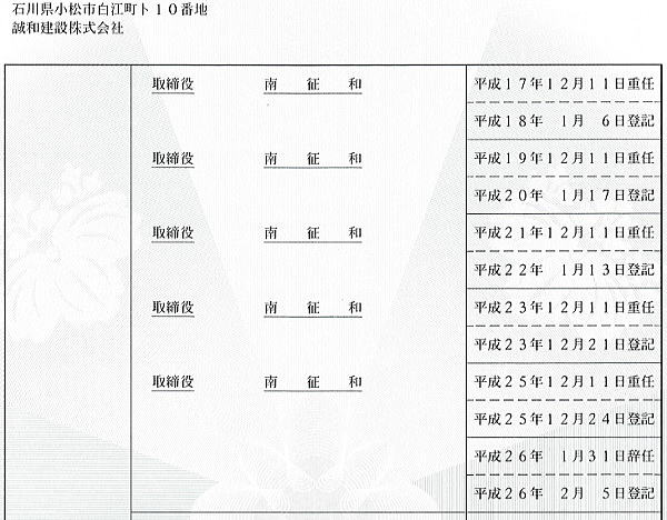 誠和建設の南征和(右)能登半島地震による被災地の現状 その5 まさかの南征和逮捕だった!2014年1月25日、石川県警金沢西警察署は、誠和建設株式会社代表取締役社長南征和容疑者を道路交通法違反(酒気帯び運転)の疑いで現行犯逮捕した。誠和建設の南征和容疑者石川県警小松警察署の警察署協議会長であった。このような石川県直轄の一般社団法人石川県構造物解体協会(会長:今村秀憲(株式会社金沢斫解体業代表取締役))の副会長で、輪島市を請け負うブロック長の誠和建設株式会社(代表取締役:南由美子、会長:南征和)には、日本政府予算の予備費から支出された総額8150億円の巨額の資金の振り分けや、地震と豪雨の被害からの復旧・復興を一体として進める被災者や事業者がなりわいの再建を行えるようにするための創造的復興はできないといえるのではなかろうか?(vol.5) |