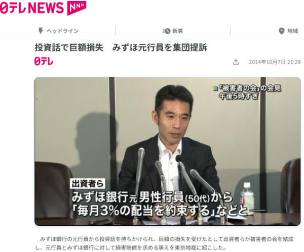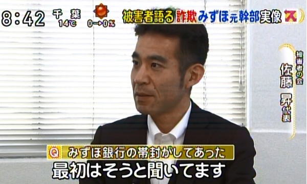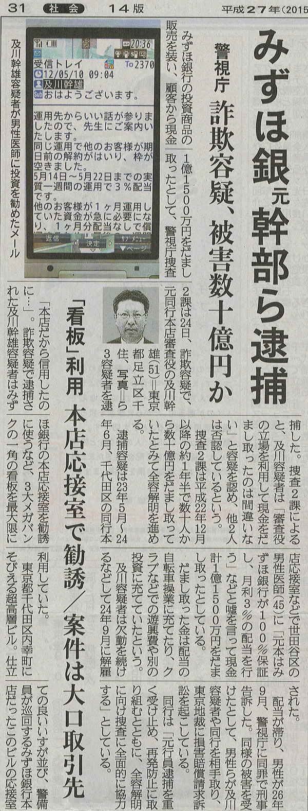 2014年10月7日、ジャーナリスト佐藤昇らは、みずほ銀行と及川幹雄を提訴して、司法記者クラブで記者会見を行った。 「I'll be back」及川幹雄(みずほ銀行元審査役)が戻ってきた その3 2021年9月頃から、及川幹雄は、ピーエムジー株式会社(PMG、代表取締役:佐藤貢、平成27年6月設立、資本金1億円、東京都新宿区西新宿2丁目4番1号 新宿NSビル25F)における及川幹雄特別枠についての勧誘を始めた。2022年6月か7月頃、みずほ銀行投資詐欺事件と同じ手法で、PMG社長室長の信用力を利用して、PMGの会議室で及川幹雄PMG特別枠の熱弁を奮っていた現場に、PMGの幹部に弁護士を連れた上で乗り込まれて、詐欺の現場を押さえられた及川幹雄は、PMGを解雇された。(vol.3) |