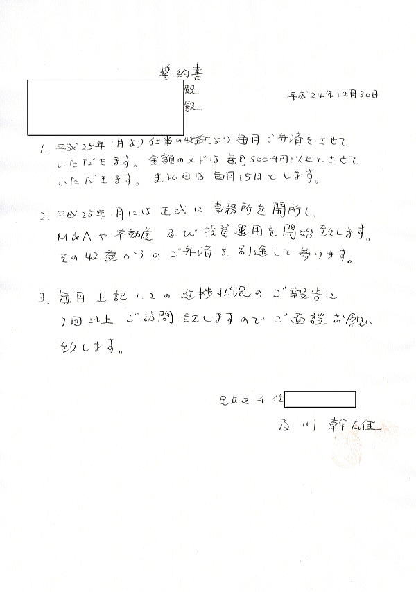 「I'll be back」及川幹雄(みずほ銀行元審査役)が戻ってきた その9 及川榮次こと及川幹雄らへの損害賠償請求事件 訴状一 請求の趣旨:及川幹雄らは、原告に対し、連帯して、金5000万円の金員を支払え。請求の原因:ファクタリング事業への出資を勧誘し、その際、元本保証、かつ、月利相当で数十%の利益保証等と宣伝して、過度に有利性や安全性等を強調した上で、原告にリスクの認識を持たせないような態様で勧誘行為を行って、原告に金員を支払らわせたという事案である。(vol.9)