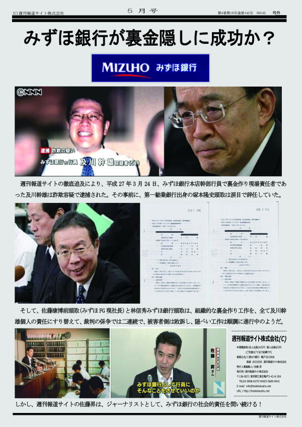 ![]() 2019年12月23日、佐藤昇は、多くの支援者たちの支えや報道関係者の仲間たちとの絆によって、創刊7年目にて「週刊報道サイト」が発刊300号の金字塔に到達できたことへの感謝の気持ちを忘れず、まだ見ぬ更なる高み「天下獲り」を目指し、「これがジャーナリズム(報道)です」と宣言します。 「未来を創るのは、私たち一人一人に他ならない。そのリスクを恐れずに、前に進もうとする意欲、それこそが新しい時代を創る原動力になります」。佐藤昇は、未来を創ろうと、みずほ銀行本店元審査役及川幹雄に3000万円を預けたが、そのまま詐取されて、訴訟代理人には判決言渡期日の3日前に佐藤昇の代理人だけを一方的に辞任された。2013年7月1日、このみずほ銀行による巨額詐欺事件が起因となり、佐藤昇は報道機関『週刊報道サイト』を創刊し、報道の原点である『権力の監視』を多くの仲間たちと力を合わせて体現して、新しい時代を創る原動力になります。(みずほFG株主総会2020参戦記vol.13) |