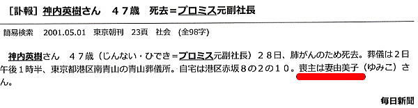「I'll be back」及川幹雄(みずほ銀行元審査役)が戻ってきた その8 2001年4月28日、消費者金融プロミスの副社長で筆頭株主の神内英樹が47歳の若さで、肺がんのため逝去した。葬儀の喪主は妻の由美子であった。そして、神内由美子は遺産の総額が約1578億円で歴代3位となった。その後、みずほ銀行本店元審査役にまで出世した及川幹雄のスポンサーとなった。みずほ銀行の闇は、全く晴れていない。(vol.8)